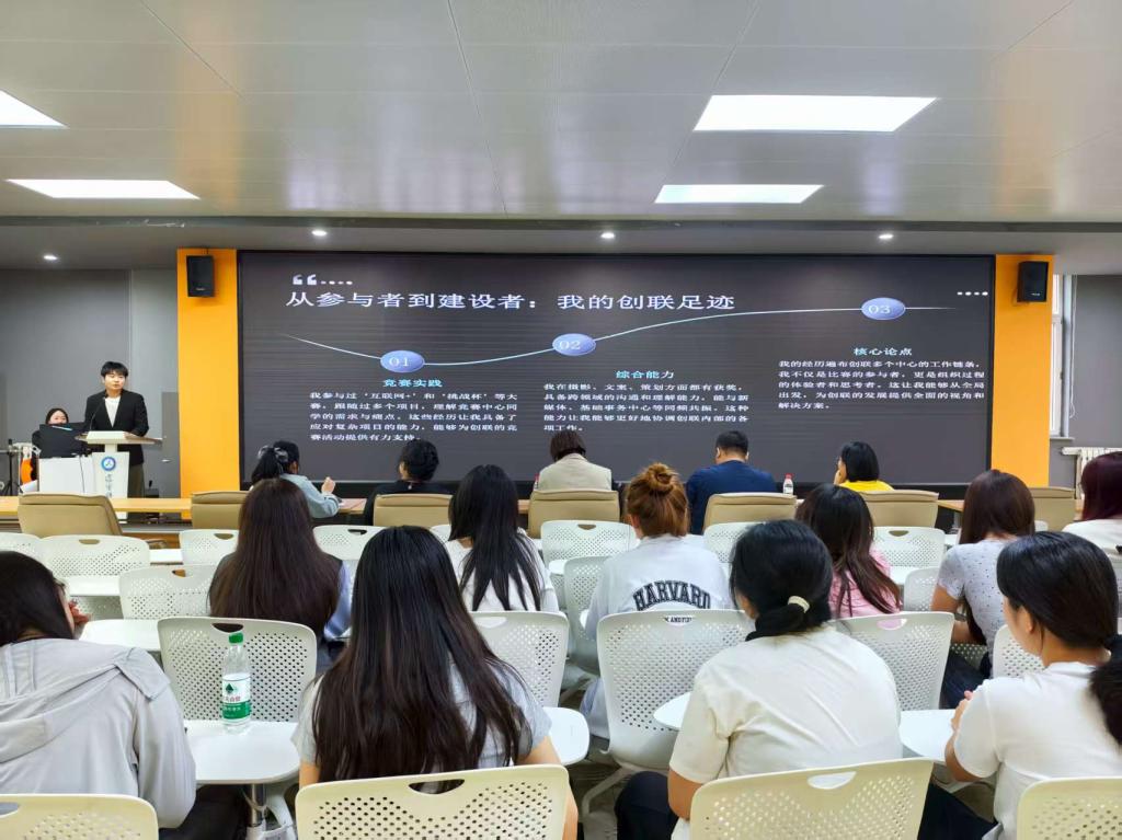 9月24日的中层岗位改选中,各部门竞选人围绕个人优势、荣誉履历、竞选竞争力及未来规划展开展示,他们以PPT罗列校级活动组织经验、学科竞赛奖项及技能认证,结合学生工作经历突出沟通协调与执行能力。在未来展望环节,候选人聚焦“优化工作流程”“提升服务效率”等具体方向,以清晰的逻辑阐述对部门发展的规划,彰显对创联工作的热忱与担当。