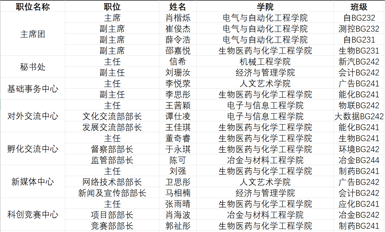 本次改选秉持公平、公正、公开原则,经院系推荐、竞选演讲、面试考核等环节,最终确定第九届学生干部名单如下: