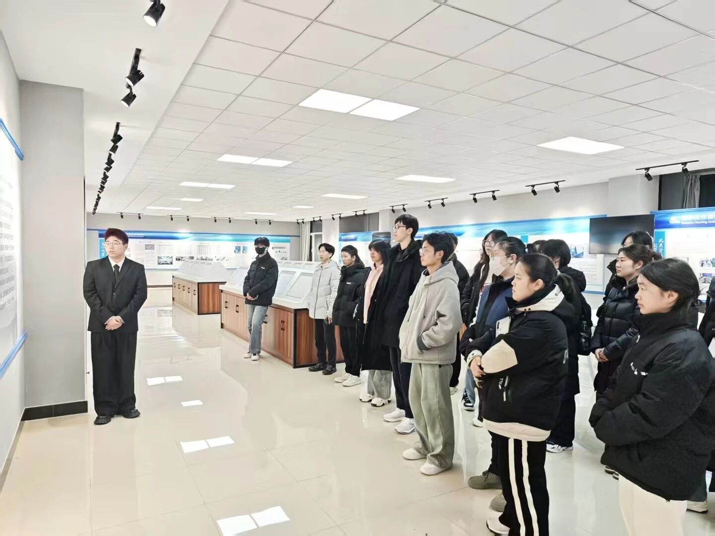 活动伊始,学生们完成签到后,在讲解员的带领下开启分层参观之旅,全方位了解智慧东楼各楼层的功能定位与特色亮点。一楼作为创新创业学院核心展示区,讲解员详细介绍了学院基本概况、历年承办的各类创新创业赛事成果、独具特色的专利树、大学生创新创业训练计划项目进展,以及各楼层的功能布局,让学生们对学校双创工作的整体架构有了清晰认知。