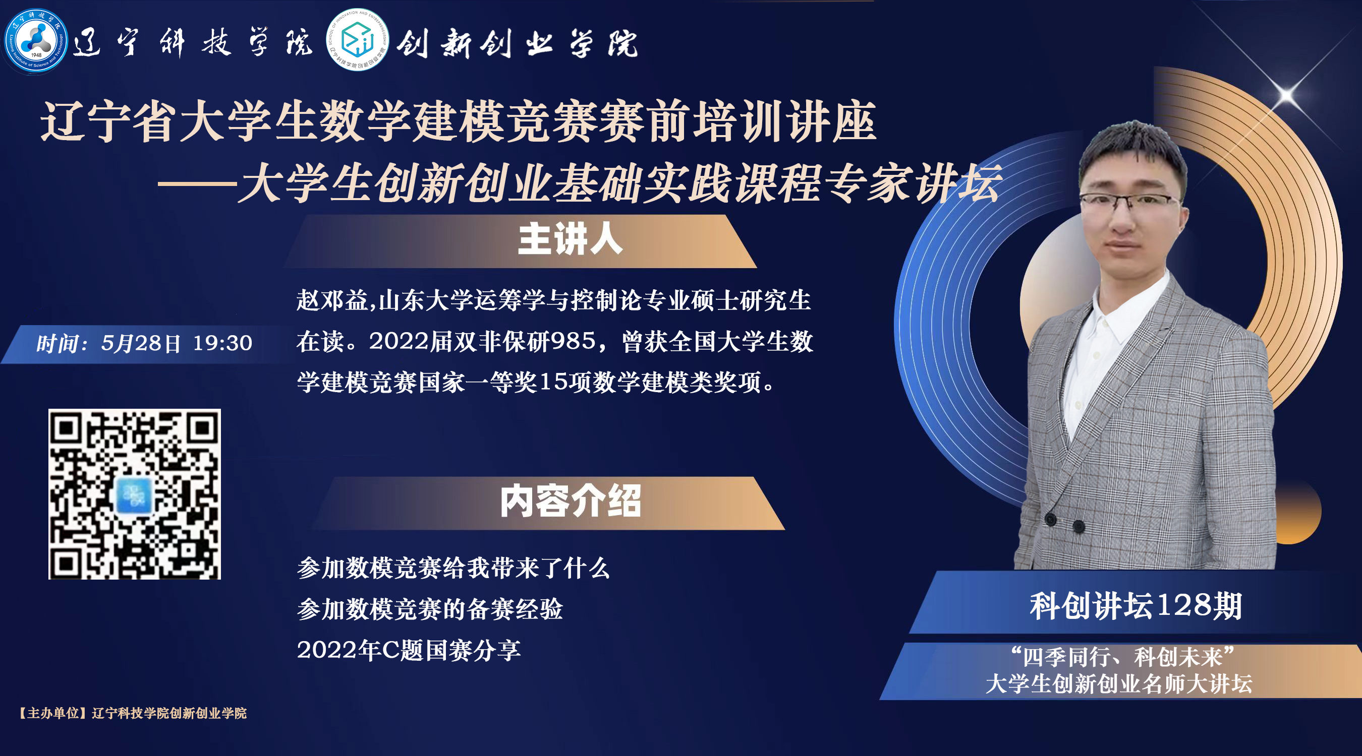 第一百二十八期科创讲坛活动通知——辽宁省大学生数学建模竞赛赛前培训 一、时间地点 时间:2023年5月28日下午19:30-20:30 地点:线上公益直播 二、活动目的 为了帮助参赛师生更好地了解数学建模竞赛相关流程和规定,数学建模竞赛优秀学长分享经验。 三、参加人员 有兴趣的老师和同学请扫码听课。 四、宣讲人 赵邓益 山东大学 运筹学与控制论专业硕士研究生在读 2022届双非保研985 曾获全国大学生数学建模竞赛国家一等奖15项数学建模类奖项 五、宣讲内容 1.参加数模竞赛给我带来了什么; 2.参加数模竞赛的备赛经验; 3.2022年C题国赛分享。 六、其他事项 欢迎各位莅临参加。 基础部 2023年5月27日